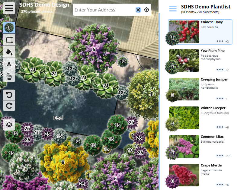 Once you’ve created your plantlist, and are in the design page, the first step is to enter your address in the upper-right corner of the design page. The map will zoom to that address, and show you the satellite view of your location.