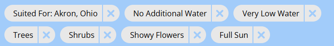 Further filter down your searches by selecting for specific irrigation requirements at your location, availability at nurseries near you, life form (i.e. tree, shrub, etc.), sun requirements, growth rate, leaf retention, height and width, flower color, blooming period and flower showiness, and common uses. Common use filters include categories like groundcover suitability, deer resistance, hedge suitability, edible plants, ease of care, street planting suitability, etc.