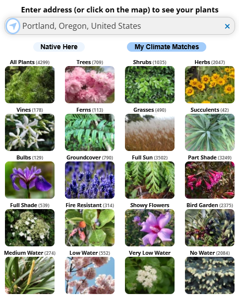 As in the home page, from the Search page (shown below) you can easily set your location then select and whether you want to see your native plants, your climate matches, or all plants in our database.