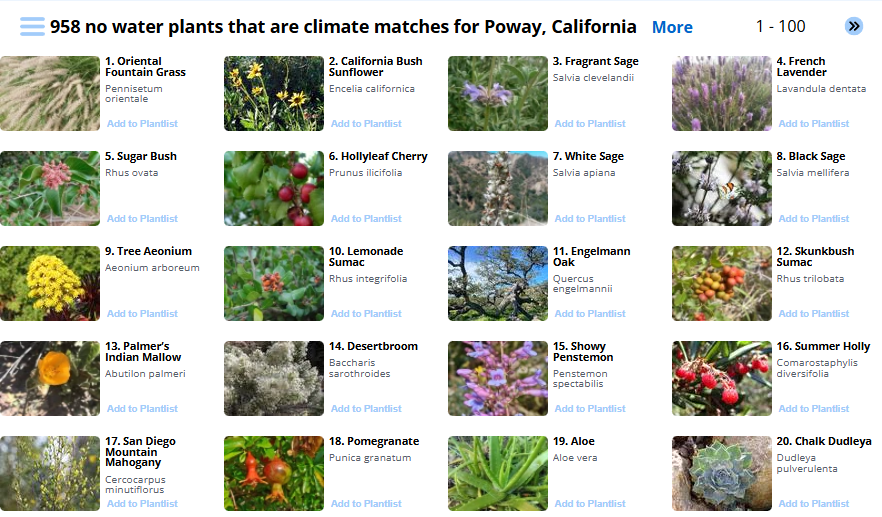 Whether coming from the home page or the search page, your plant results will first appear as a grid of 100 plant thumbnails per page in a “Browse” page (as illustrated below).. By default, plant results will appear in order of most recommended to least recommended. Recommendation rankings are based on climate suitability to your location and overall landscaping popularity.